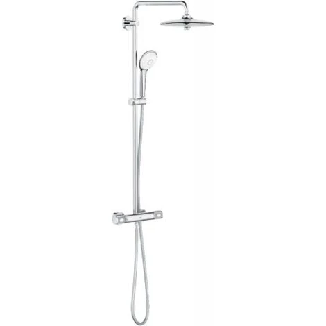 Description Colonne de douche avec mitigeur thermostatique.Système Grohe CoolTouch : corps froid du mitigeur.Bras de douche de 450 mm orientable horizontalement.Douche de tête Euphoria 260 mm avec 3 jets (pluie, jet, SmartRain) avec rotule (angle de rotation± 15°).Douchette à main Euphoria à 3 jets.Flexible Silverflex 1,75 m à surface lisse.Régulation thermostatique quasi-instantanée.Système d’économie d’eau Grohe EcoJoy®.Procédé anti-calcaire SpeedClean®.Convient pour chauffe-eau instantané à partir de 18 kW/h.