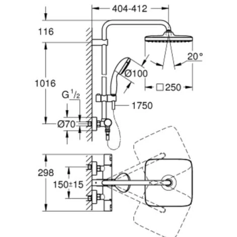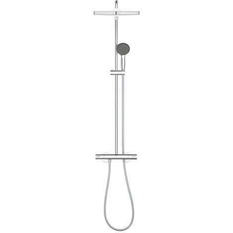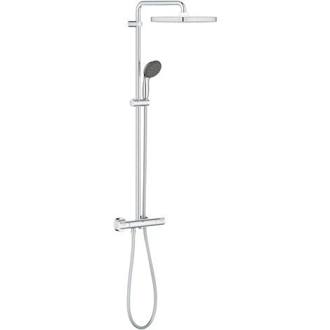 Caractéristiques de la nouvelle colonne de douche Grohe avec mitigeur thermostatique + Douche de tête XXL 250mm + Douchette 2 jets, Chrome, Grohe 250 Cube (26696022) :