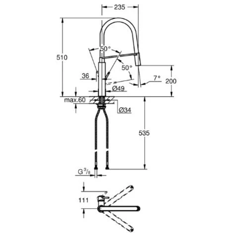 Caractéristiques du Mitigeur cuisine semi-pro avec flexible hygiénique noir et douchette 2 jets, Chrome, Grohe Concetto (G-31491000) :