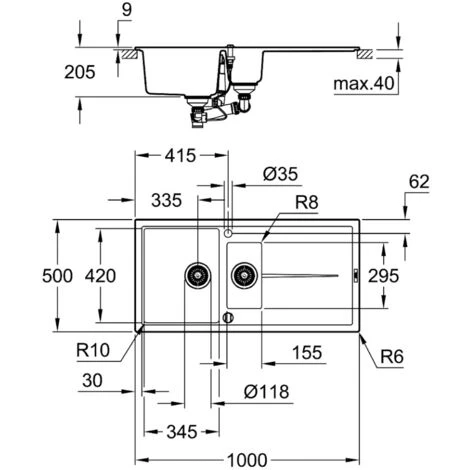 Caractéristiques techniques de l évier composite avec égouttoir gris granite 1000 x 500 mm K400 GROHE