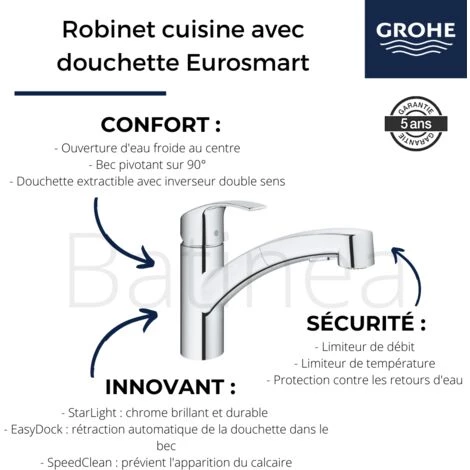 Points forts du robinet cuisine avec douchette extractible GROHE Eurosmart