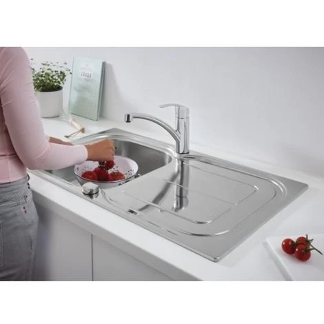 Produit NouveauEvier inox à encastrerPack évier Inox 1 cuve K300 avec mitigeur de cuisine Eurosmart bec bas Pack complet comprenant un évier + un mitigeur de cuisine.Évier percé Ø 35 pour robinetterie rotative d’évacuation.Surface en Inox lisse.Réversible pour cuve à droite ou à gauche.M Fabrication Européenne 5 Ans Garantie