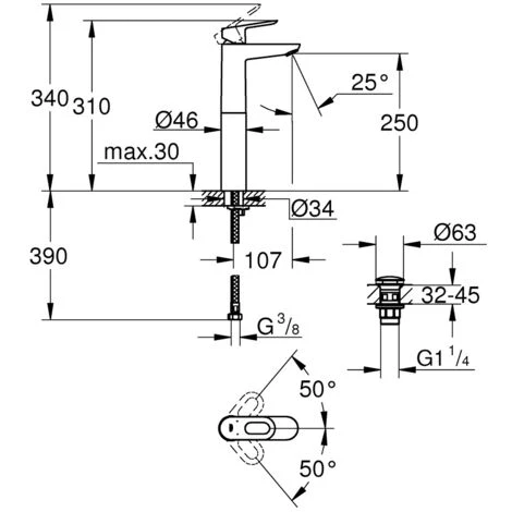 Caractéristiques du mitigeur monocommande lavabo taille XL, Chrome Grohe Start Loop (23781000) :